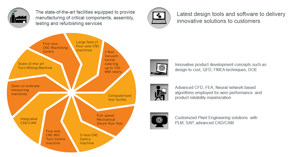 The manufacturing and assembly of a steam turbine involves high level of precision engineering employing numerous components and sub-assemblies. The mechanical integrity and tolerances are very critical to the product performance, efficiency and reliability. The state of the art manufacturing processes and machinery are deployed for in-house manufacture of critical components such as casings, rotors, blades, labyrinth packing and oil seal holders.